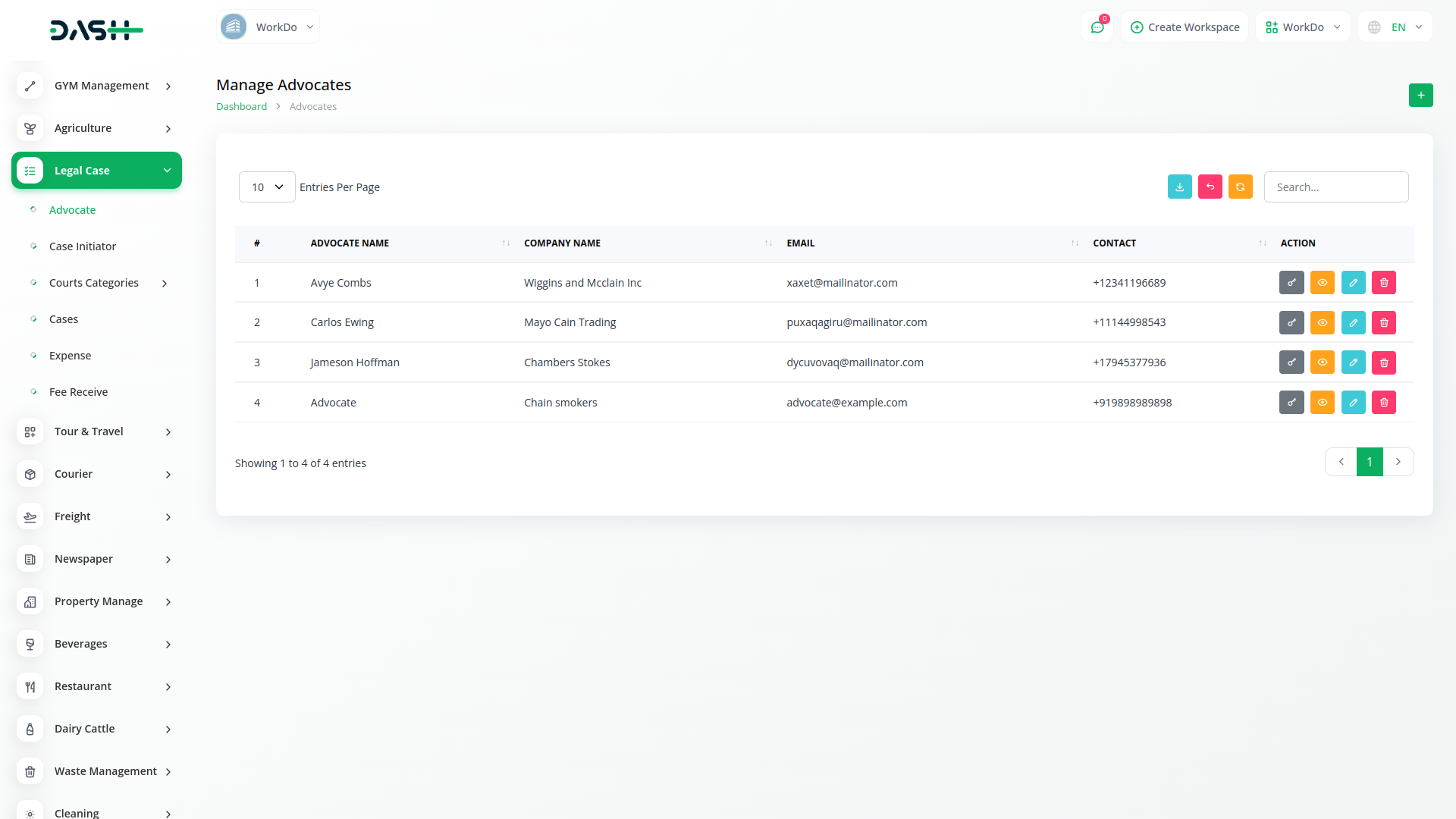 For advocates, the module offers a straightforward way to view and handle details such as names, company affiliations, and contact information. It provides essential actions like editing advocate information, resetting passwords, and deleting advocate records. This ensures that user interactions with advocate data are intuitive and effective.