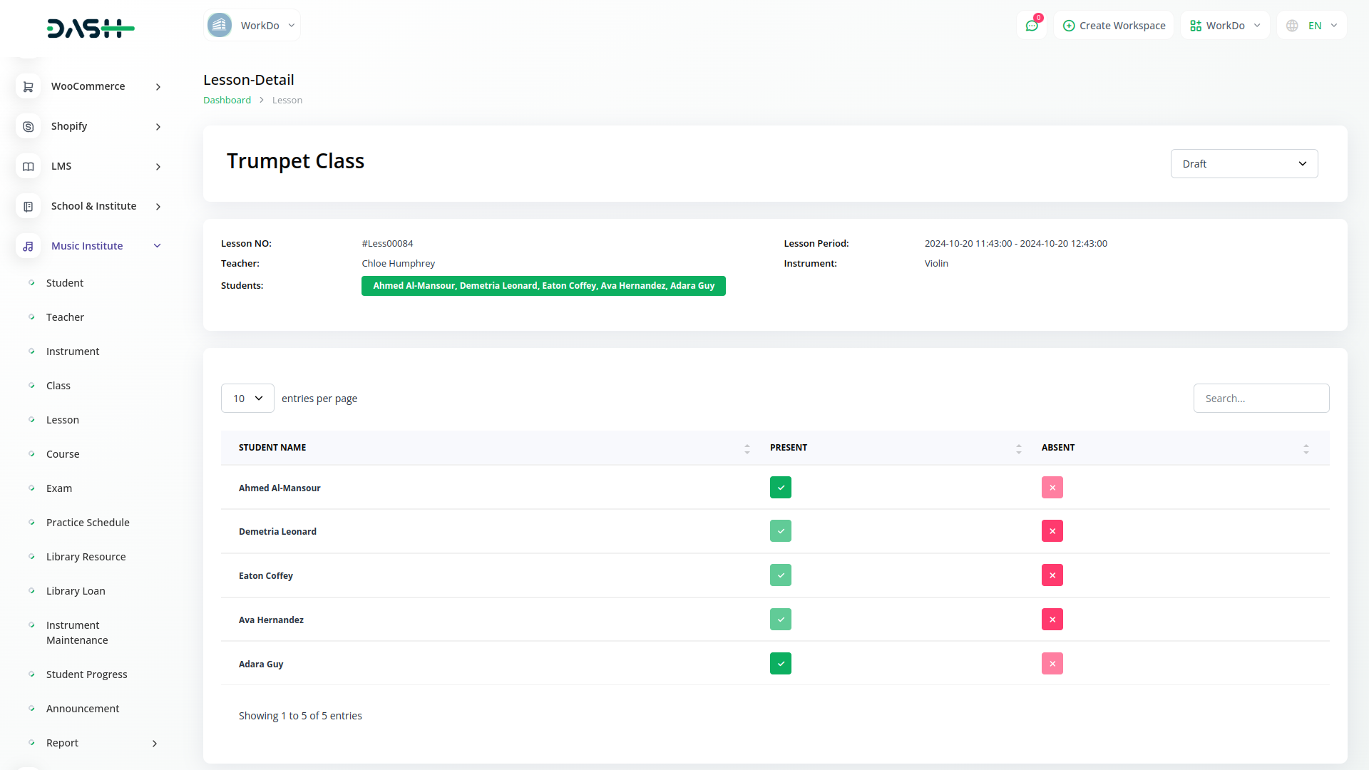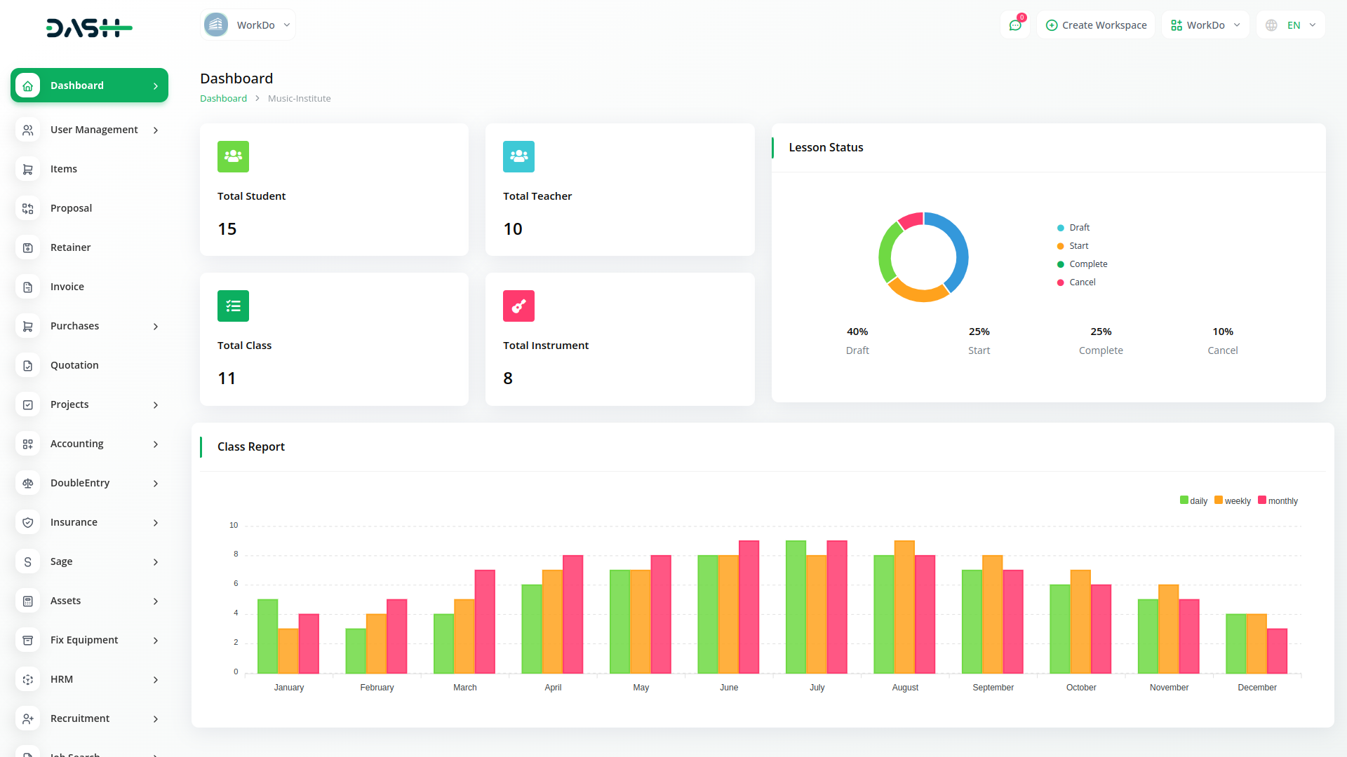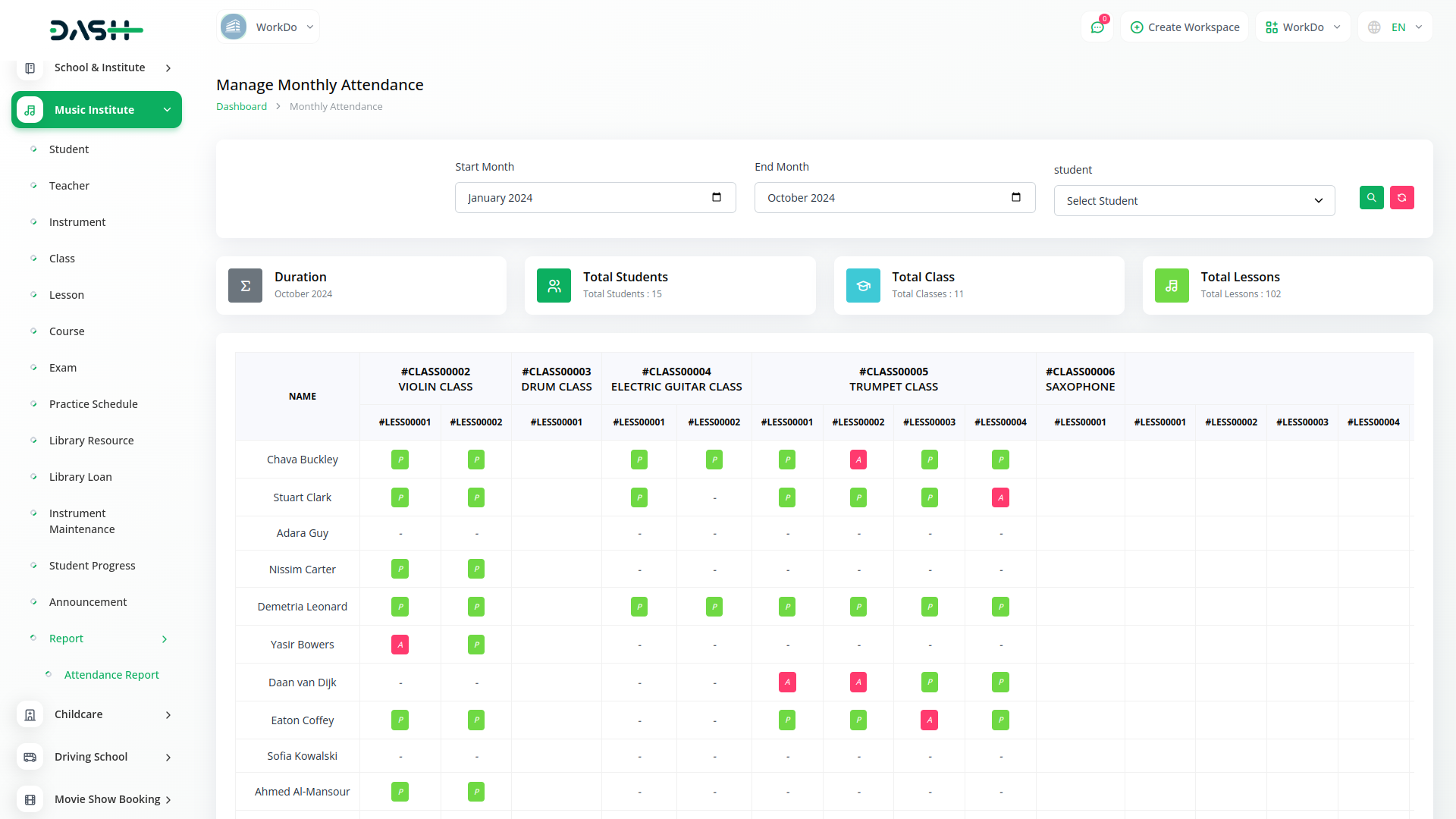 Dash SaaS`s Music Institute Module is like a musical playground, simplifying class details, attendance, and logins for students and teachers to enjoy a harmonious learning experience.