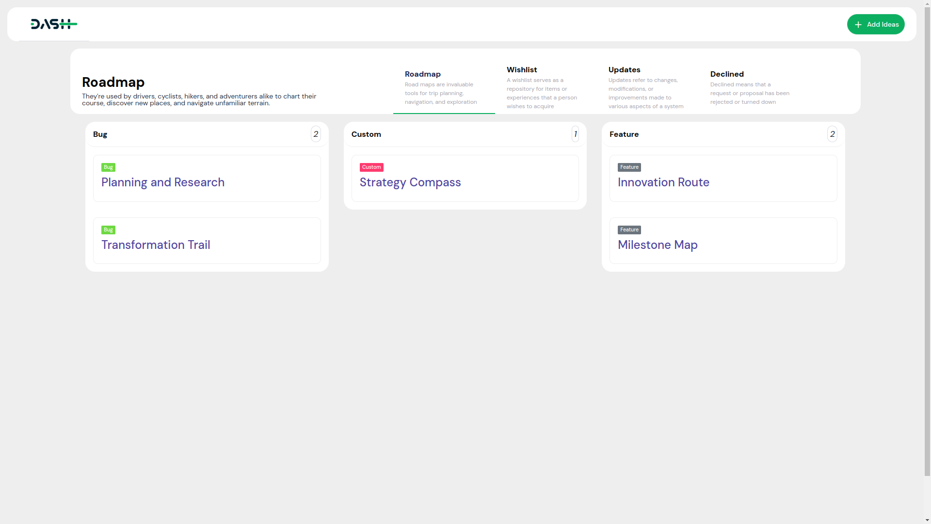 Welcome to RoadMapCentral, the place where your ideas turn into reality. Here at Dash SaaS, we're committed to providing you with a platform that meets your needs, and RoadMapCentral is an essential part of that commitment. Whether you have a suggestion for a new feature, an enhancement to an existing one, or a bug fix, RoadMapCentral is where you can make your voice heard.